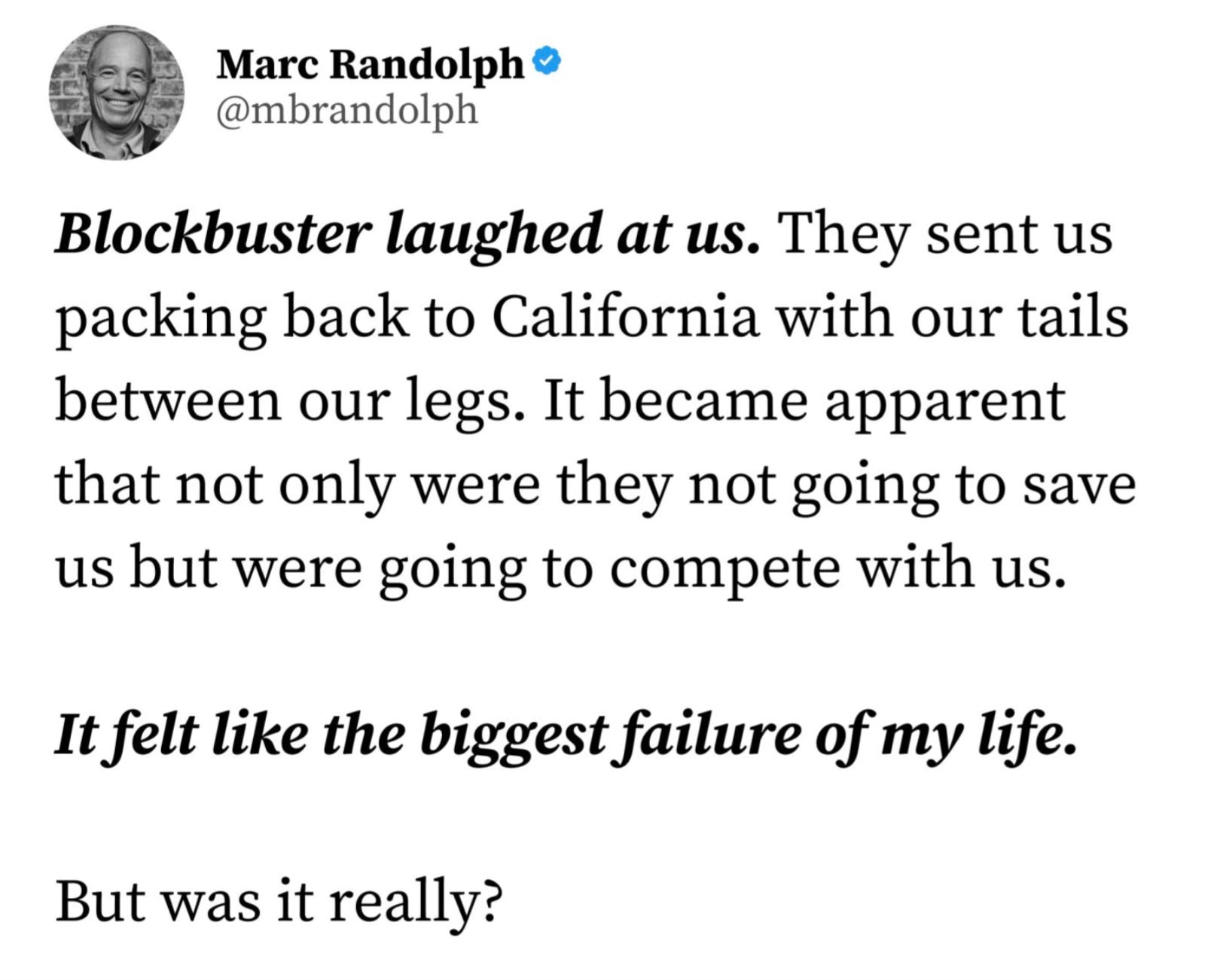 Okay, I hear you thinking, but why do I have to deal with these business models for a semester now? Well, digital business models have disrupted numerous industries in recent decades (hello booksellers! What was a video rental store again?). And we are nowhere near the end of the story. Managers in all sectors must therefore at least get their heads around digital business models in order to understand how they will be affected. Even if it seems like the core offering does not change for some companies (e.g. selling razors), parts of the business model might change, such as the distribution channel, providing an attack vector for new competitors (e.g. selling razor online via subscriptions, hello Dollar Shave Club). And that can be quite dangerous, as we can see from some examples. I'm sure you know the Netflix story, I've heard it a dozen times too, but it's always mind-blowing to me when I hear it again. In 2000, Netflix wanted to sell itself to the video rental giant Blockbuster for $50 million (back then Blockbuster hat 9000+ stores). Blockbuster laughed at the founders, rejected their offer and sent them home. The rest is history… as of today, Netflix has a market capitalization of $420 billion (2025) and Blockbuster is out of business. Netflix co-founder Marc Randolph writes on Twitter (er, sorry, on X) about this incident with Blockbuster: